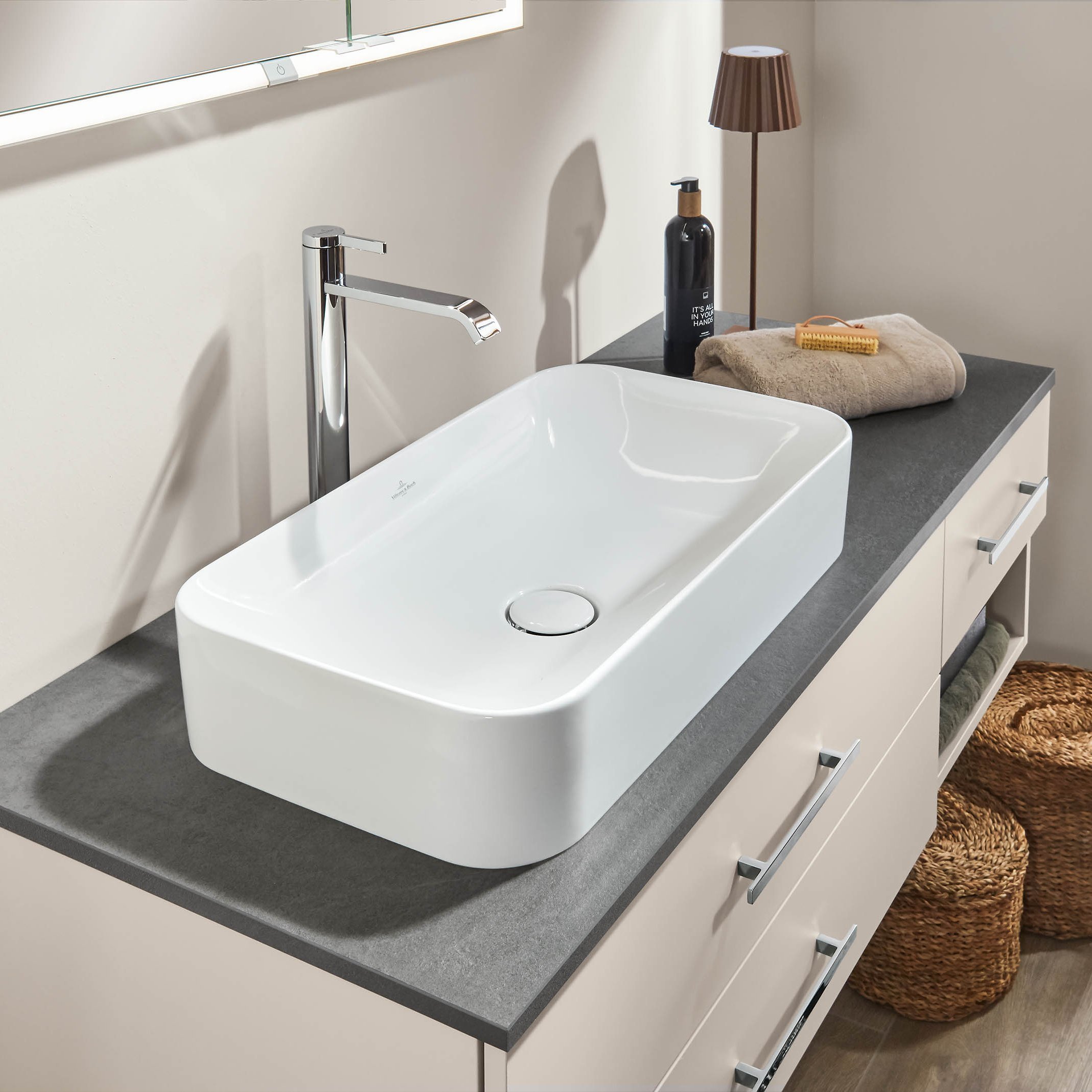 Das geräumige Solitärmöbel in Sandgrau-Matt und die gleichfarbige 2morrow Platte Classic ergänzen sich optimal. Die schwebende, asymmetrische Anordnung sorgt für Stauraum mit großzügigen Ablageflächen und erzeugt dabei eine Leichtigkeit, die durch den Reflection Lichtspiegel LUCA noch unterstützt wird. Zusammen mit platzsparenden Cubes in Kontrastfarbe entsteht eine moderne Badlösung.